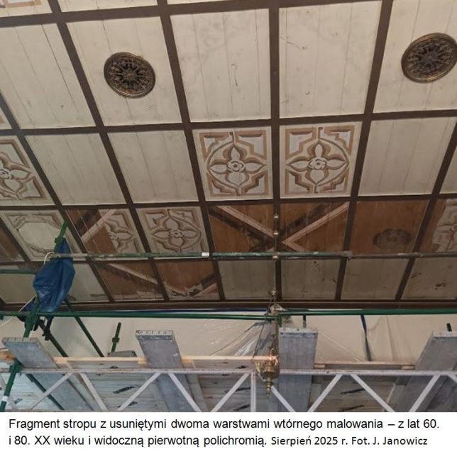 Od sierpnia br. trwają prace konserwatorskie drewnianego stropu z odsłonięciem i odtworzeniem polichromii z XIX wieku. Prace polegają na usunięciu dwóch warstw wtórnego malowania – z lat 60. i 80. XX wieku, o których mowa na wstępie.
