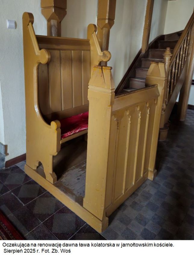 Chcę tu przy okazji zwrócić uwagę też na mały szczegół dostrzeżony w jarnołtowskim kościele, a mianowicie na fakt, iż na renowację i wyeksponowanie oczekuje historyczna już, skromna ława kolatorska. Ława, która w swej budowie zawiera elementy kolistych łuków podobnych do łuków konstrukcji zwieńczenia ołtarza i wyeksponowanych w drewnianej zabytkowej chrzcielnicy. Siadali na niej dawni właściciele jarnołtowskiego majątku ziemskiego, być może generał-major August Friedrich Ernst Bernard hrabia von Hülsen, który zmarł w 1858 r. Z pewnością siadał na niej jego następca Friedrich Wilhelm baron Prinz von Buchau, który był fundatorem remontu kościoła po pożarze oraz baron von Spiegel-Borgenbrech. Właściciele majątków ziemskich na terenie parafii tradycyjnie byli patronami, fundatorami i kolatorami kościoła. Mieli oni prawo do umieszczania w kościele kolateralnym tablic nagrobkowych i dysponowali własnymi ławkami (ława kolatorska).